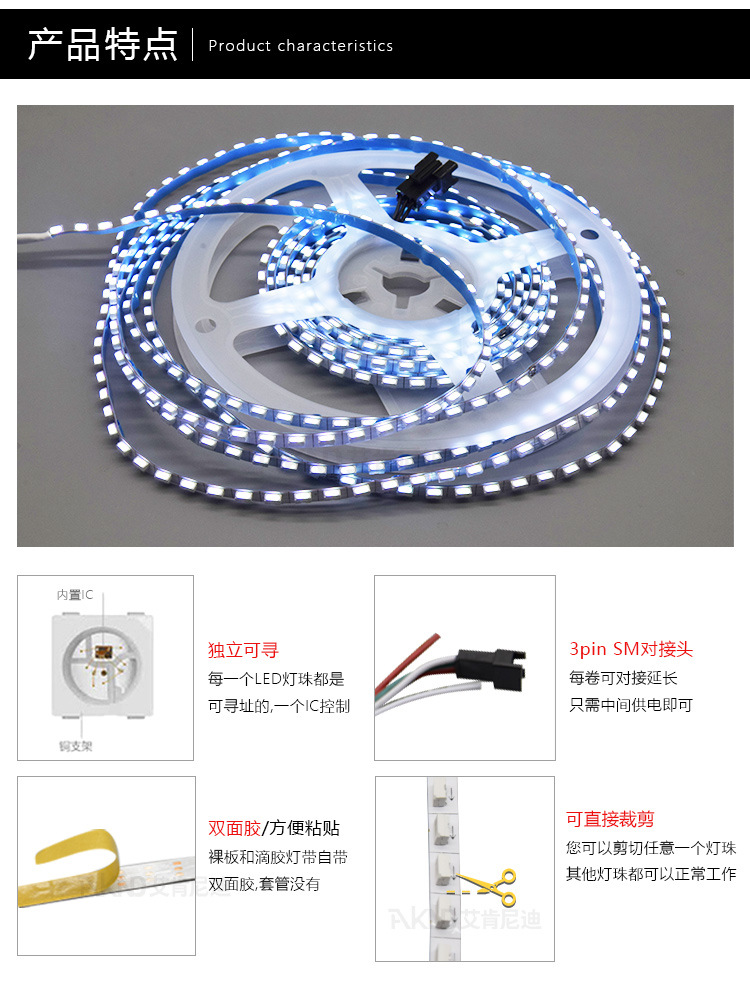 本品采用非常柔软的PCB 板为基板,高亮度贴片LED,顶部发光,每颗灯为一个基本单元,五米/卷,可根据使用长度要求,在任意单元剪断。由于使用高品质的柔性PCB 以及专业的设计,极大的改善了柔性光条的品质稳定性,可任意弯曲,安全可靠。